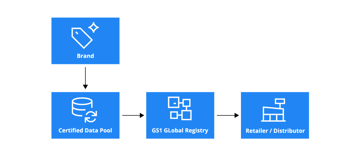 The brand or manufacturer uploads validated product and company data to its certified data pool.