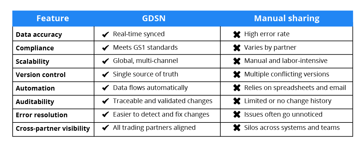 This is the foundation of global data synchronization: one product record, shared automatically, updated instantly and trusted by all parties involved.