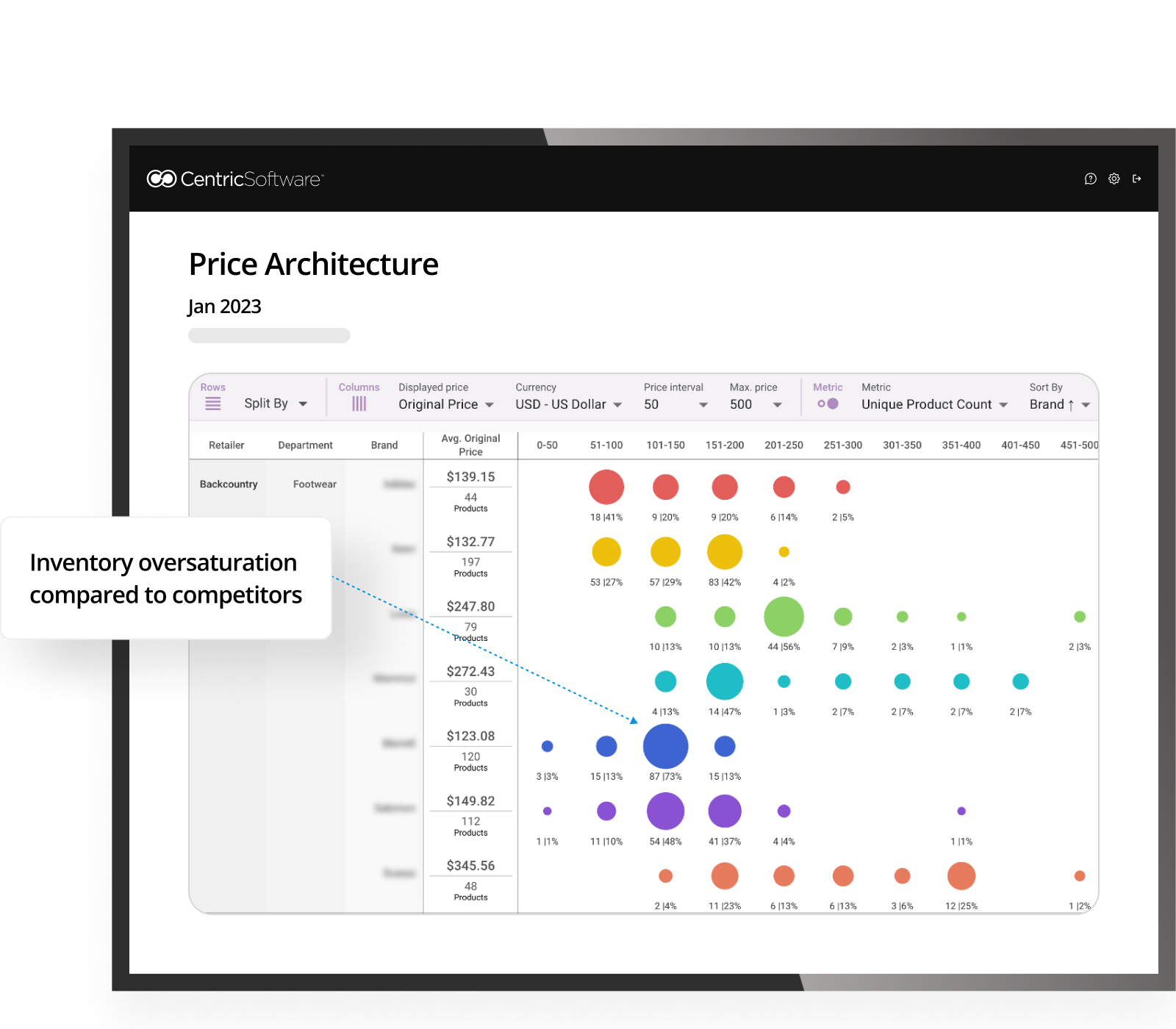Slice and dice competitor data by color and gain a quick snapshot of the color make up of competitors. This image indicates there may be an under-development in blue but a competitor looks like they’re over-developing in beige.