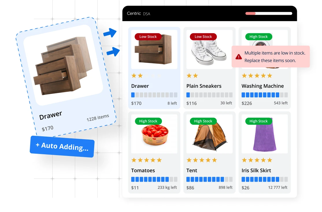 Centric DSA collects product content, pricing, ratings, reviews and stock availability data directly from marketplace APIs. Depth of data depends on each channel’s API, but all captured data is standardized and AI-enriched to be actionable.
