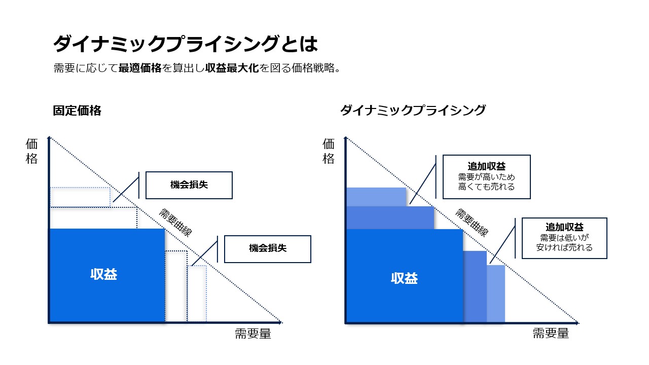 「変動料金制」や「動的価格設定」とも呼ばれ、需要が高い場面では価格を引き上げ、需要が低い場面では価格を下げることで、固定価格では取りこぼしていた販売機会を捉え収益最大化を図ります。